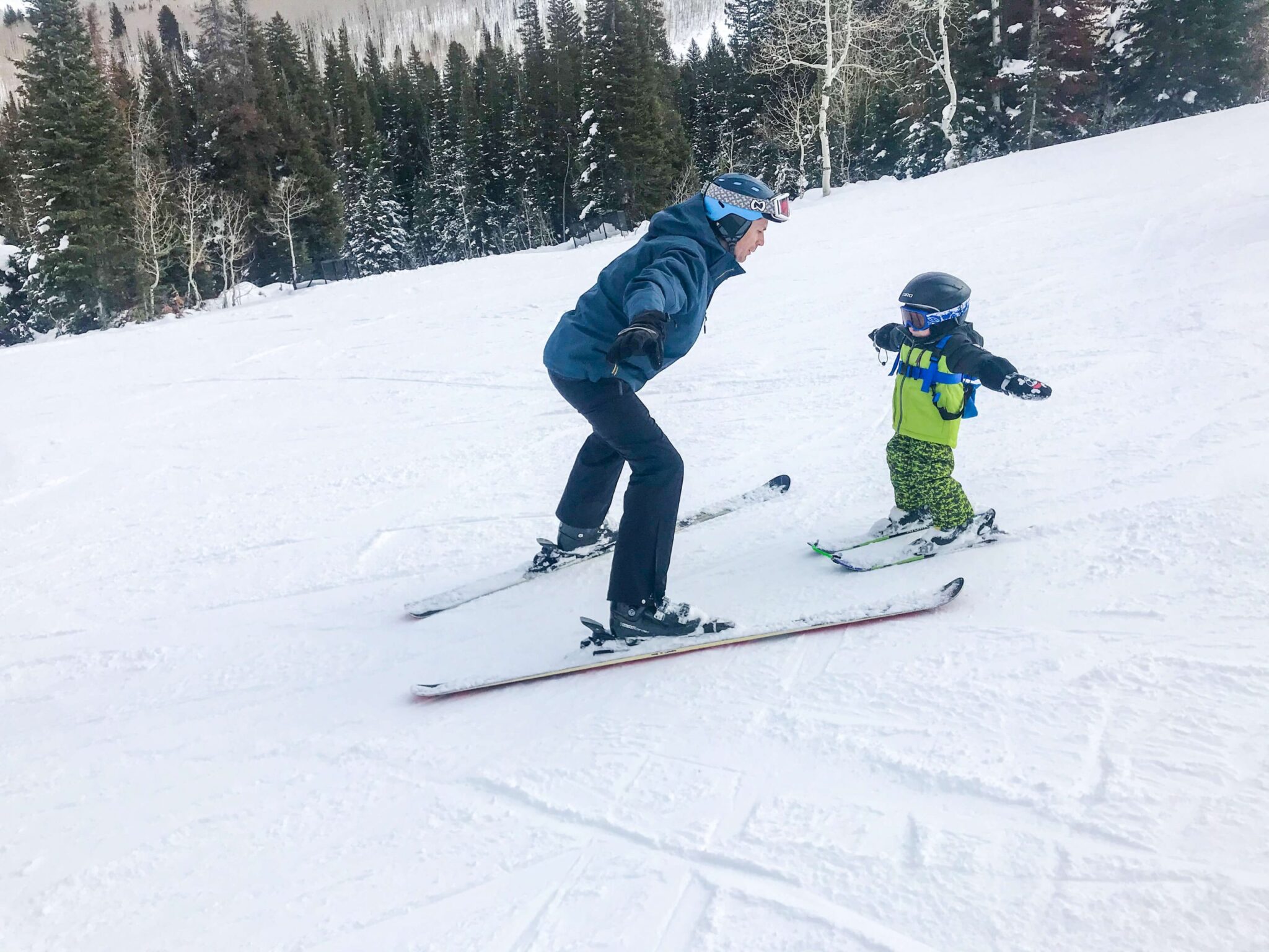 We use a ski harness without leashes EVERY SINGLE TIME that we take our little kids skiing. It’s a lifesaver. In fact, the harness that we use has leashes that tuck into the backpack, but we rarely ever take them out to use them. For us, we prefer to have a harness that has leashes for those rare runs that we need leashes when we are skiing with a toddler.